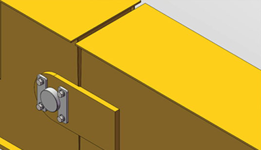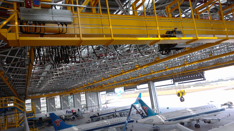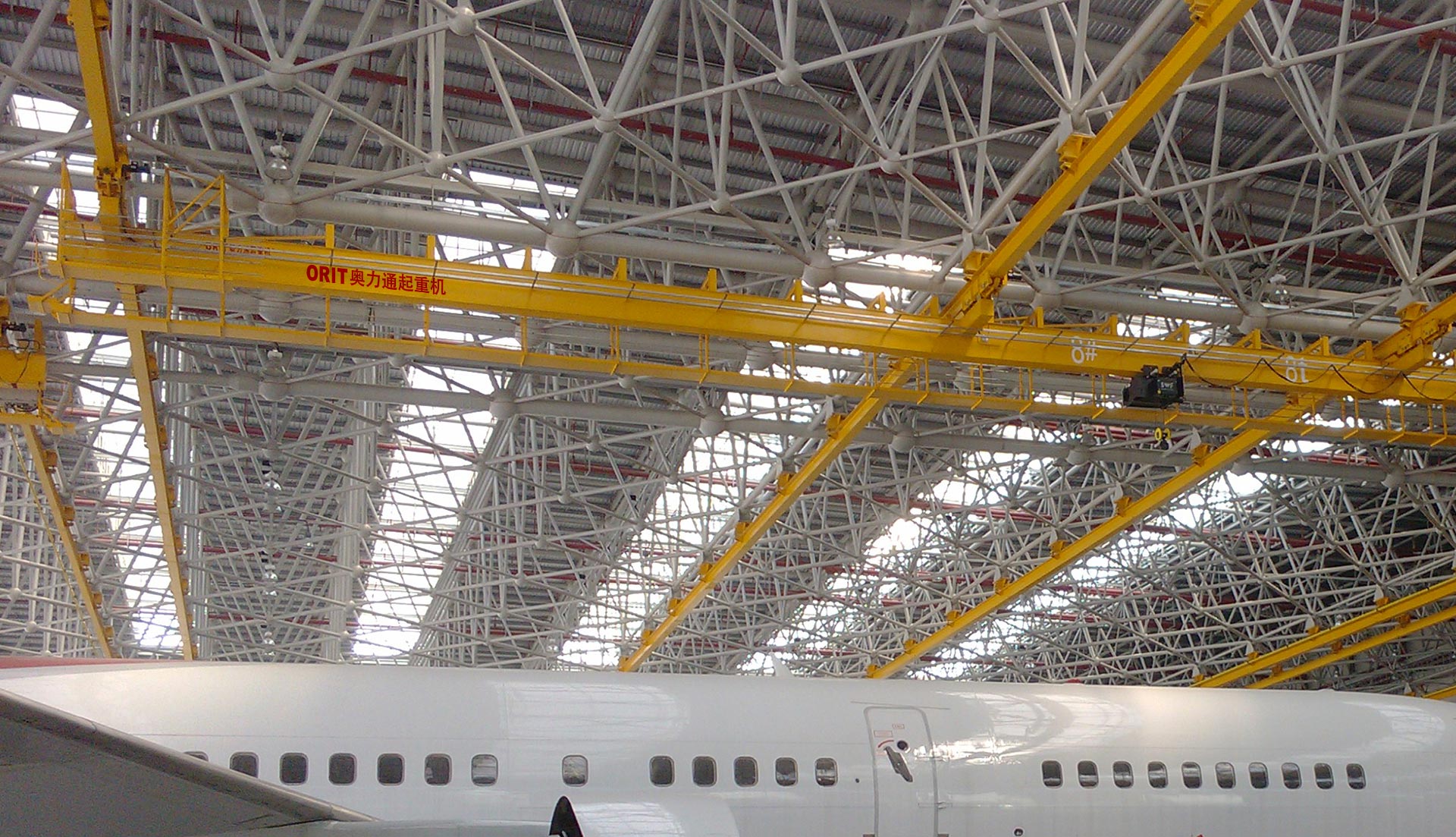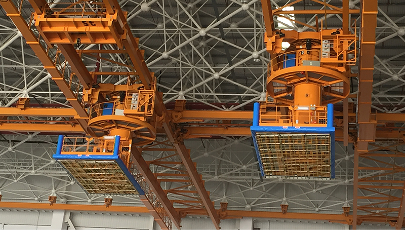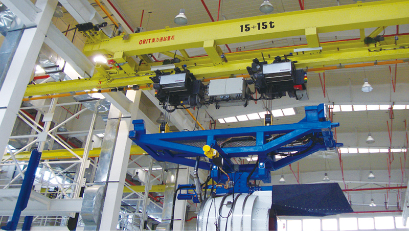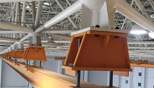 专利技术: 南宫发明专利技术(ZL 2009 10143701.X)吊点新设计为“柔性吊点”,是在原来的刚性吊点基础上增加吊杆和关节球轴承的可调部分,关节球承选用自润滑型,免维护设计,吊杆选用高强特制螺杆,连接强度高,便于轨道垂直方向调节;有效减小网架变形对起重机的影响。具有水平位移自动纠正功能;具有自适应性,避免啃轨;设计简单、制作方便、成本低廉。柔性主梁可有效减小侧向应力,避免啃轨,保证运行更加平稳。