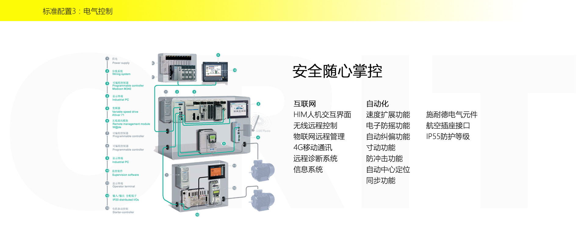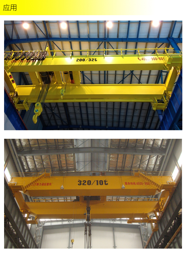 产品名称:大吨位起重机 优化设计,自重轻,轮压小,高度矮 硬齿面柔性驱动,紧凑型结构 变频控制,运行平稳 实时安全监控,确保吊运安全 标准化配置,让性能无比稳定 适用于500t以下双梁起重机 标准配置1:起升机构 颠覆传统,自成一体 SWL(t) HOL(m) 5-500t Max.160m 欧式智能卷扬 高度矮,自重轻,节约建筑成本 重级制,满足持续重载作业 柔性驱动,内应力小,传动效率高 免维护 适配各种吊具 智能化:寸动/微动/电子防摇 故障自诊断系统及HMI 标准配置2:三合一驱动 静音科技,静享搬运 结构紧凑,铝合金壳体,密封 变频电机+硬齿面减速箱+盘式制动器 龙门专用C型三合一集成化设计,节约空间 全变频调速 最高转速4800 r/min 防护等级IP55 半油脂润滑,免维护 静音科技,静享搬运 标准配置3:电控系统 安全随心掌控 智能安全监控器 计算起升机构剩余安全工作时间 累计起升工作时间 累计超载次数 累计起升电机启动次数 起升电机过热保护及报警 刹车片厚度报警 ... ... 远程通讯 施耐德电气元件 航空插座接口 IP55防护等级 互联网+ HIM人机交互界面 无线远程控制 物联网远程管理 4G移动通讯 远程诊断系统 信息系统 自动化 速度扩展功能 电子防摇功能 自动纠偏功能 寸动功能 防冲击功能 自动中心定位 同步功能 标准配置4:端梁 多变灵活,适应自如 模块化直驱设计 自重轻、体积小 多种连接方式,安装尺寸灵活 适用各种厂房,降低厂房高度 QT700车轮,自润滑,更静音 采用调心轴承,适应更自如 应用