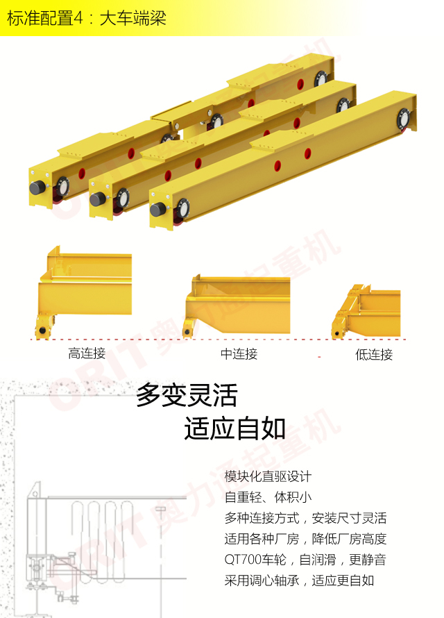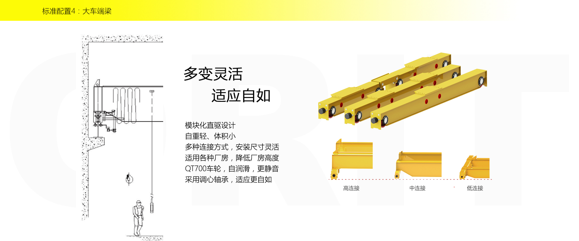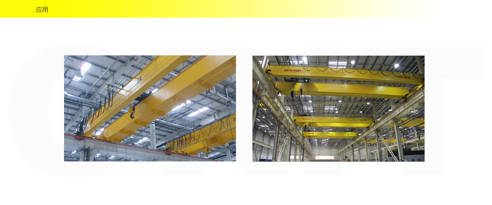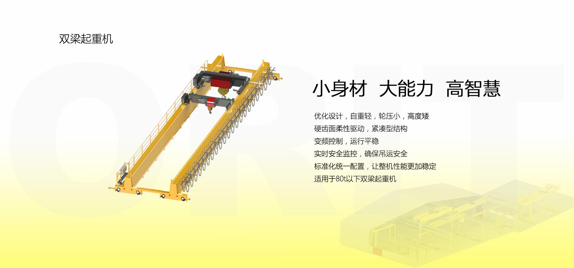 产品名称:双梁桥式起重机 小身材、大能力、高智慧 优化设计,自重轻,轮压小,高度矮 硬齿面柔性驱动,紧凑型结构 变频控制,运行平稳 实时安全监控,确保吊运安全 标准化配置,让性能无比稳定 适用于80t以下双梁起重机 标准配置1:起升机构 颠覆传统,自成一体 SWL(t) HOL(m) 0.8t-80t Max.90m 低净空设计 柔性驱动,内应力小,传动效率高 柔性铰接小车架 重级制电机,接电持续率60%ED 行走变频无极调速,运行平稳 自调试电磁盘式制动器,可靠,防尘 2160N/mm² 高强度镀锌钢丝绳,免维护 全周型导绳器,防松绳 全系标配安全监控系统 标准配置2:三合一驱动 静音科技,静享搬运 结构紧凑,铝合金壳体,密封 变频电机+硬齿面减速箱+盘式制动器 三合一集成化设计 全变频调速 最高转速4800 r/min 防护等级IP55 半油脂润滑,免维护 静音科技,静享搬运 标准配置3:电控系统 安全随心掌控 智能安全监控器 计算起升机构剩余安全工作时间 累计起升工作时间 累计超载次数 累计起升电机启动次数 起升电机过热保护及报警 刹车片厚度报警 ... ... 远程通讯 施耐德电气元件 航空插座接口 IP55防护等级 标准配置4:端梁 多变灵活,适应自如 模块化直驱设计 自重轻、体积小 多种连接方式,安装尺寸灵活 适用各种厂房,降低厂房高度 QT700车轮,自润滑,更静音 采用调心轴承,适应更自如 应用