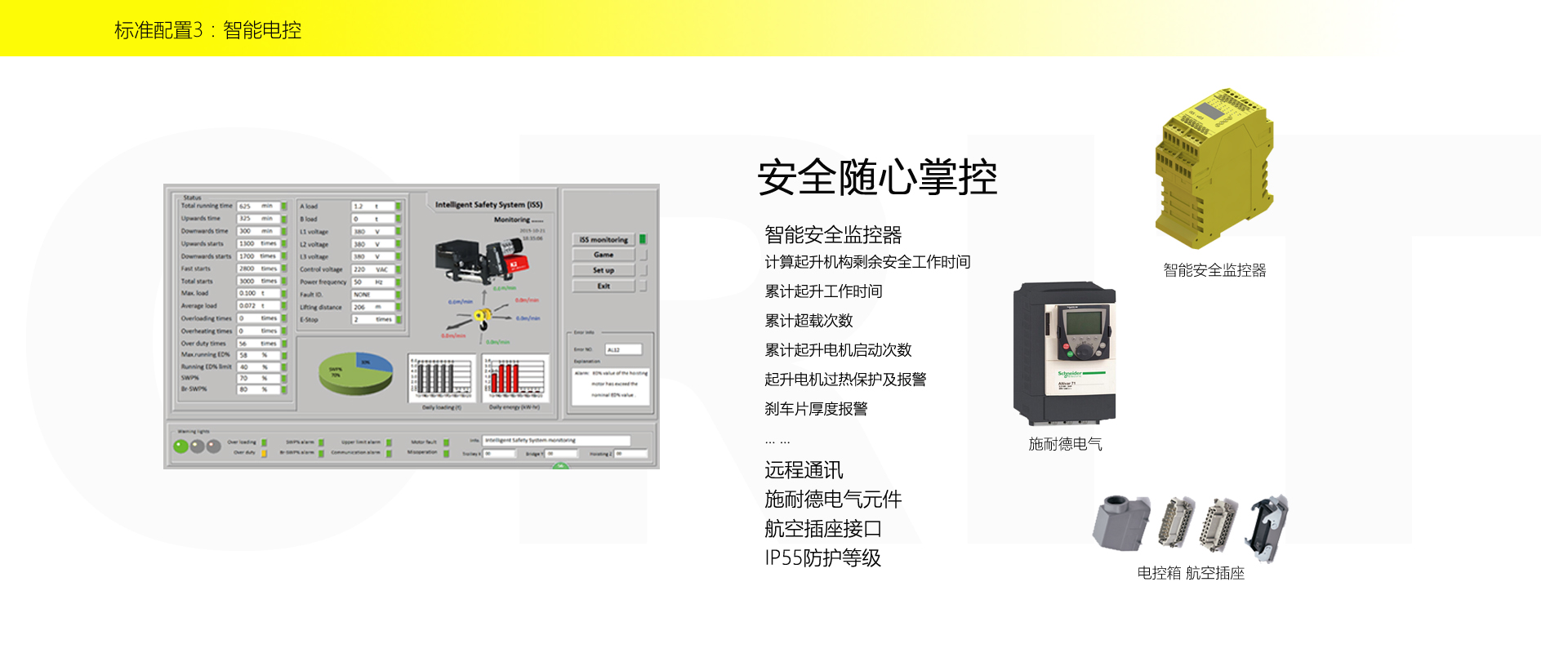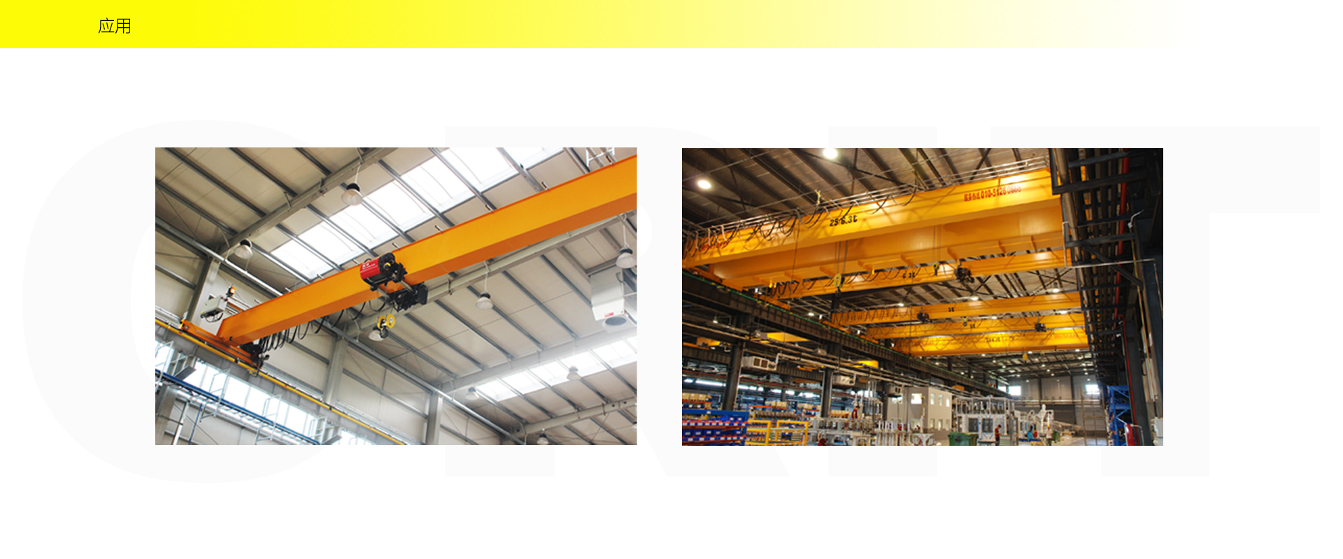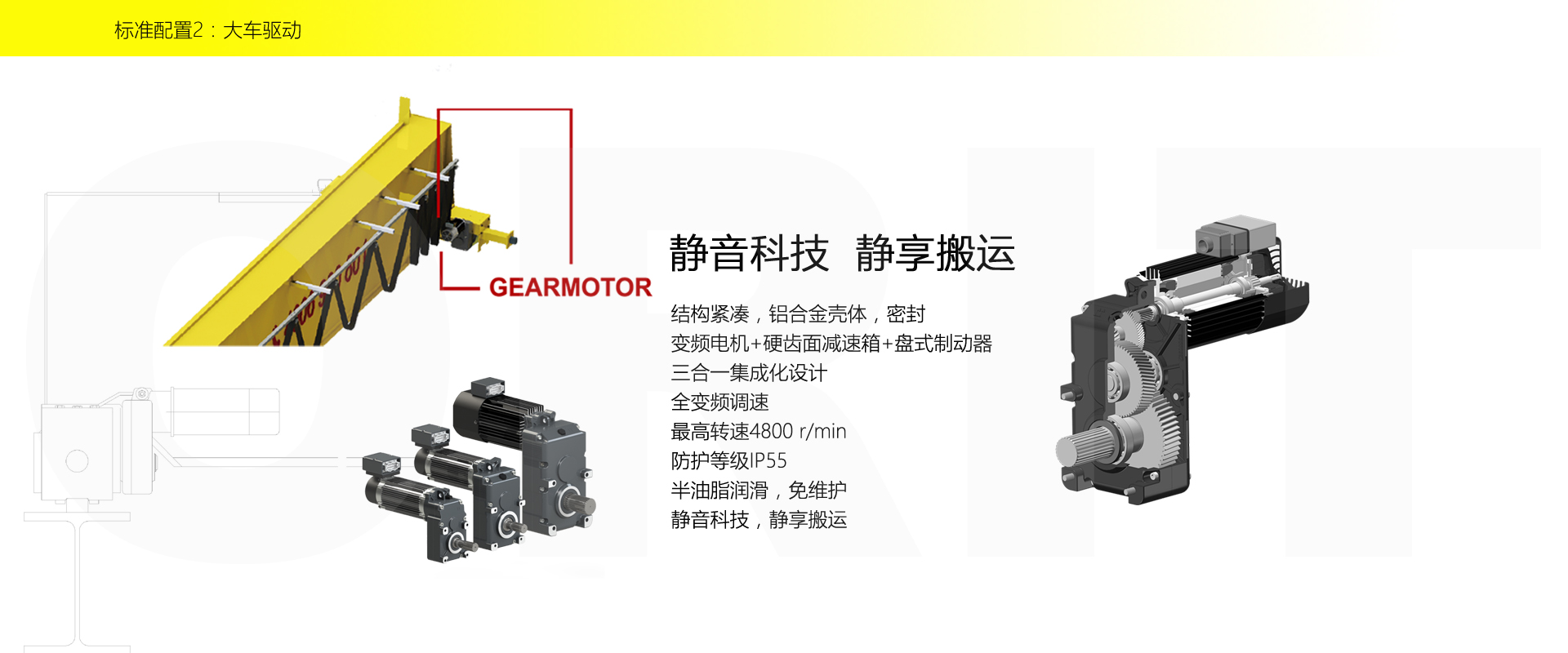 产品名称:单梁桥式起重机 小身材、大能力、高智慧 优化设计,自重轻,轮压小,高度矮 硬齿面柔性驱动,紧凑型结构 变频控制,运行平稳 实时安全监控,确保吊运安全 标准化配置,让性能无比稳定 适用于32t以下额定载荷 标准配置1:起升机构 颠覆传统,自成一体 低净空设计 柔性驱动,内应力小,传动效率高 重级制电机,接电持续率60%ED 行走变频无极调速,运行平稳 自调试电磁盘式制动器,可靠,防尘 2160N/mm² 高强度镀锌钢丝绳,免维护 全周型导绳器,防松绳 全系标配安全监控系统 标准配置2:三合一驱动 静音科技,静享搬运 结构紧凑,铝合金壳体,密封 变频电机+硬齿面减速箱+盘式制动器 三合一集成化设计 全变频调速 最高转速4800 r/min 防护等级IP55 半油脂润滑,免维护 静音科技,静享搬运 标准配置3:电控系统 安全随心掌控 智能安全监控器 计算起升机构剩余安全工作时间 累计起升工作时间 累计超载次数 累计起升电机启动次数 起升电机过热保护及报警 刹车片厚度报警 ... ... 远程通讯 施耐德电气元件 航空插座接口 IP55防护等级 标准配置4:端梁 多变灵活,适应自如 模块化直驱设计 自重轻、体积小 多种连接方式,安装尺寸灵活 适用各种厂房,降低厂房高度 QT700车轮,自润滑,更静音 采用调心轴承,适应更自如 应用