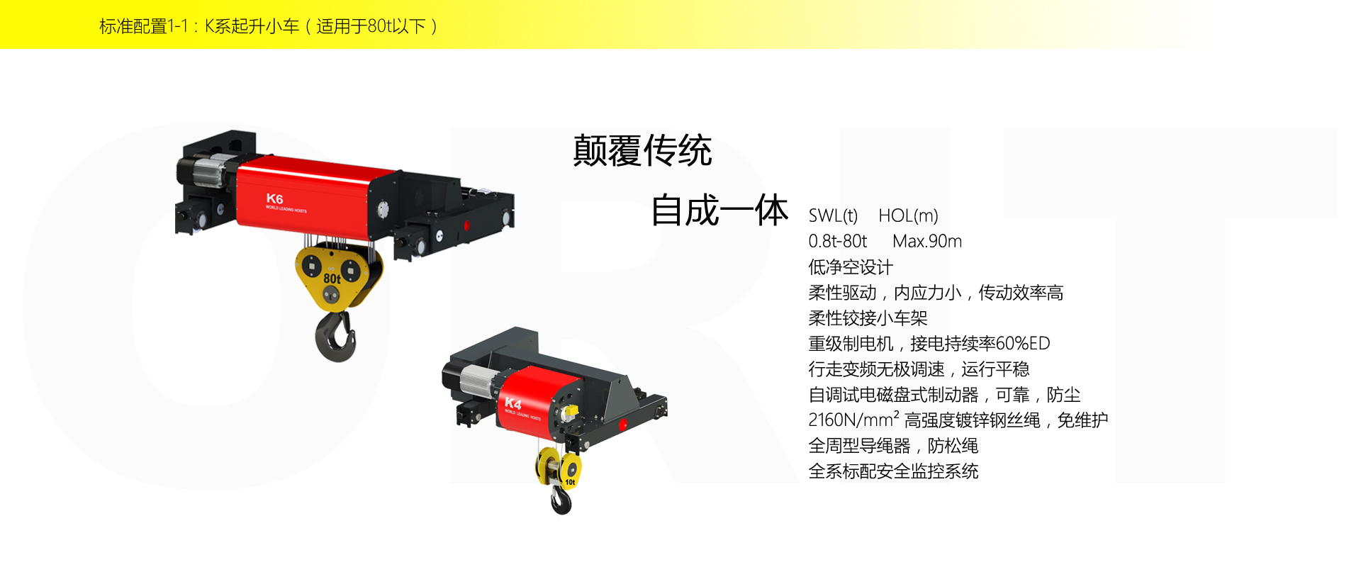 产品名称:双梁门式起重机 刚柔并济 小体积 大能耐 优化设计,结构紧凑 柔性支腿,有效释放应力,延迟结构寿命 柔性支腿,体积小,节省空间 变频控制,运行平稳 实时安全监控,确保吊运安全 标准化配置,让性能无比稳定 配置K系起升,适用于80t以下额定载荷 无牛腿车间搬运的最佳解决方案 配置CM智能卷扬起升,适用于500t以下额定载荷起吊 标准配置1-1:起升机构 SWL(t) HOL(m) 0.8t-80t Max.90m 低净空设计 柔性驱动,内应力小,传动效率高 柔性铰接小车架 重级制电机,接电持续率60%ED 行走变频无极调速,运行平稳 自调试电磁盘式制动器,可靠,防尘 2160N/mm² 高强度镀锌钢丝绳,免维护 全周型导绳器,防松绳 全系标配安全监控系统 标准配置1-2:起升机构 颠覆传统,自成一体 SWL(t) HOL(m) 5-500t Max.160m 欧式智能卷扬 高度矮,自重轻,节约建筑成本 重级制,满足持续重载作业 柔性驱动,内应力小,传动效率高 免维护 适配各种吊具 智能化:寸动/微动/电子防摇 故障自诊断系统及HMI 标准配置2:三合一驱动 静音科技,静享搬运 结构紧凑,铝合金壳体,密封 变频电机+硬齿面减速箱+盘式制动器 三合一集成化设计 全变频调速 最高转速4800 r/min 防护等级IP55 半油脂润滑,免维护 静音科技,静享搬运 标准配置3:电控系统 安全随心掌控 互联网+ HIM人机交互界面 无线远程控制 物联网远程管理 4G移动通讯 远程诊断系统 信息系统 自动化 速度扩展功能 电子防摇功能 自动纠偏功能 寸动功能 防冲击功能 自动中心定位 同步功能 智能安全监控器 计算起升机构剩余安全工作时间 累计起升工作时间 累计超载次数 累计起升电机启动次数 起升电机过热保护及报警 刹车片厚度报警 ... ... 远程通讯 施耐德电气元件 航空插座接口 IP55防护等级 标准配置4:端梁 多变灵活,适应自如 模块化直驱设计 自重轻、体积小 重型端梁,组合形式多样,满足不同承载需求 柔性连接,均分轮压 防出轨装置 集中润滑装置 车轮纠偏装置 柔性支腿 刚柔并济,轻巧强悍 一侧刚性支腿,主端梁直接螺栓刚性连接 一侧柔性支腿,主端梁通过铰座柔性连接