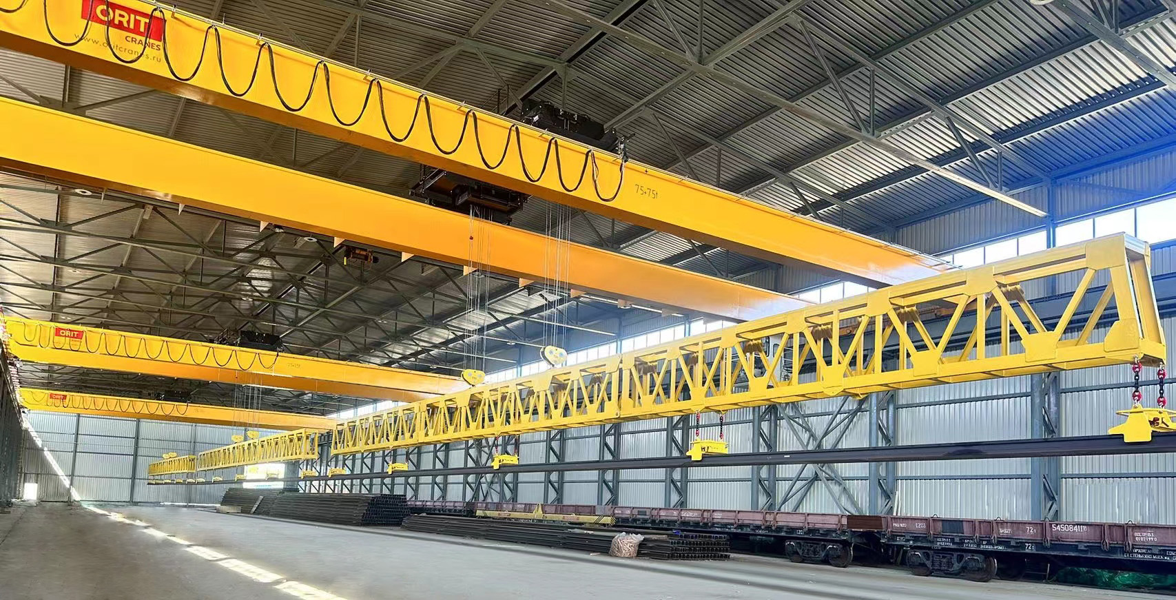 南宫长轨自动吊,三车联动定位精度高,一次性起吊多根几百米长的超长轨道,实现所有钢轨同步抓取、同步卸货,作业效率高、用工成本低。