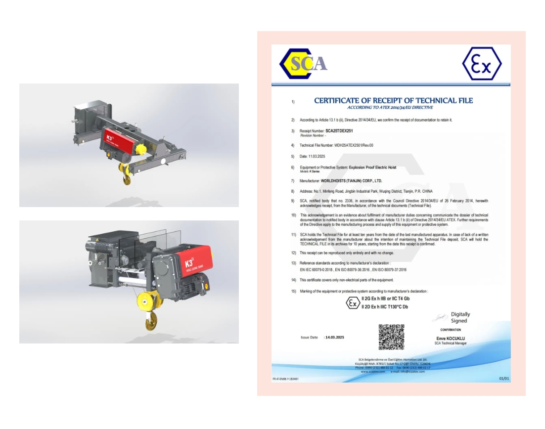 ATEX认证不仅是欧盟市场的准入标准,更被中东、东南亚等地区广泛采信。这一认证的获得,将助力南宫起重机快速进入欧洲化工、石油、制药等高附加值行业,为全球客户提供更安全、更可靠的起重解决方案。